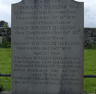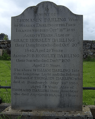 The replica headstone above the grave of Grace Darling and her family, St Aidan's churchyard, Bamburgh. The weathered original is on display at the RNLI Grace Darling Museum in Bamburgh.