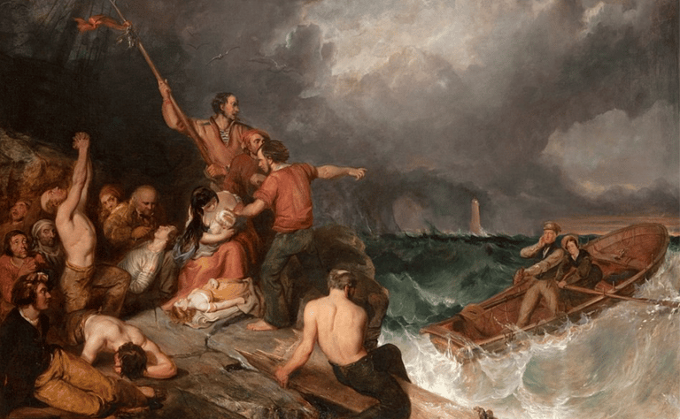 Together, William and Grace launched their 21-foot, four-man Northumberland coble into the violent sea. Grace, displaying remarkable seamanship, kept the small rowing boat steady in the heaving waters while her father helped survivors aboard: four men and one woman, Sarah Dawson, who had watched helplessly as her two young children—James, aged seven, and Matilda, just five—were swept away during the night.