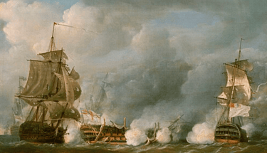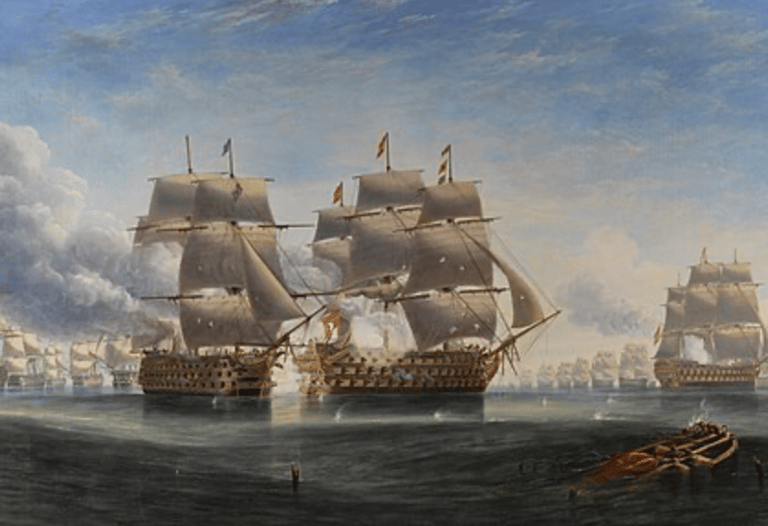 Several other enemy vessels came to Santa Ana's assistance, hemming in the Royal Sovereign on all sides. The British flagship was severely damaged and left unable to maneuver after being dismasted, but she was relieved by the arrival of the rest of the British squadron. Not long afterward, Santa Ana struck her colours.
